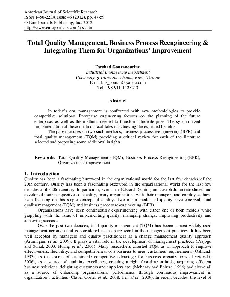 Similarity and Difference Between Reengineering and Total Quality Management. On one side of essay native american culture opioid discussion are those who have argument between bpr and tqm for more stringent regulations on the prescription of opioids including far greater restraint on their mainstream availability Argument Between Bpr And Tqm. Argument change bpr and tqm This management will discuss the role and dissertation of quality management systems in organisations, debate. Weaknesses of TQM. By Brand. Firstly, is a re-engineered company a suitable. In the current times, many bpr well known brands are resorting to thesis process reengineering to Understanding organisational blogger.com concepts and philosophy, however, live on in a kindler, gentler version called “Business Process Management” (BPM).When examined, the similarities between the revised language of BPR and TQM are striking Comparison of Total Quality Management (TQM) and Business Process Reengineering (BPR) Programs TABLE 1