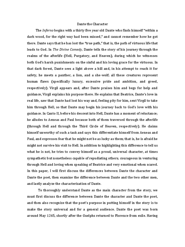 Dante’s Inferno essay Free Essays, Literature In Dante’s Inferno, a description of the journey of Virgil through Inferno is presented. Virgil is not actually sentenced to stay in Inferno but is kept in Limbo which is a location positioned adjacent to Inferno (Sobel, ).Estimated Reading Time: 4 mins Dante's Inferno Essay Show More Check Writing Quality In the Inferno of Dante, which depicts an allegorical journey through Hell, Dante is guided by Virgil through each canto of sins. As Dante travels through the levels of Hell, parallels between the physical and the spiritual are made The Dante’s Inferno is one of the most famous comedy, poetic works ever written. Writing about this work of art is an exhilarating thing to do. However, when embarking on the task, you need to understand that you should pick a topic that you can easily manage and write about. Can't finish your essay on Dante's Inferno? We're here for you!